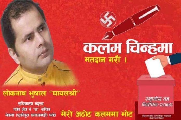 पर्वत-नेकपा एकीकृत समाजवादीको तर्फबाट फलेवास नगरपालिका-४, मुडिकुवाको वाड अध्यक्षमा लोकनाथ भुसाल “घायलश्री” चयन भएका छन् । आज बसेको नगर कमिटीको बैठकले घायलश्रीलाई पार्टीको तर्फवाट वाड अध्यक्षमा सिफारिस गरेको हो ।