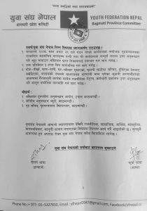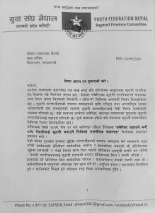 युवा संघ नेपाल वागमति प्रदेश कमिटीले आज सरकारका मुख्य सचिव शंकरदास बैरागीलाई ज्ञापन पत्र बुझाउँदै भूटानी शरणार्थीका नाममा नेपालीको मानव तस्करी गर्ने गिरोहलाई कारवाही गर्न माग गरेको छ ।