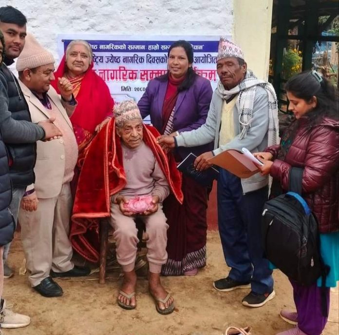 सम्मानित जेष्ठ नागरिक मध्य नगर भरिकै जेष्ठ नागरिक एक पटकलाई दोहोरिन सक्ने प्रावधान नगरले कार्यक्रममा उल्लेख गरेको छ। यसवर्ष वडा नम्बर १० कुर्घा छागादी कि ९६ वर्षीए भागिरथी शर्मा र वडा नम्बर ११ पाङराङ्का ९६ वर्षीय कर्ण मल्ल नगरकै जेष्ठ नागरिक सम्मानित भएका छन्। शर्मा र मल्ल जनही रु ३ हजार ७ सय ५० रुपैयाँ, सम्मान पत्र, दोसल्ला र फलफूलसहित सम्मानित भए।