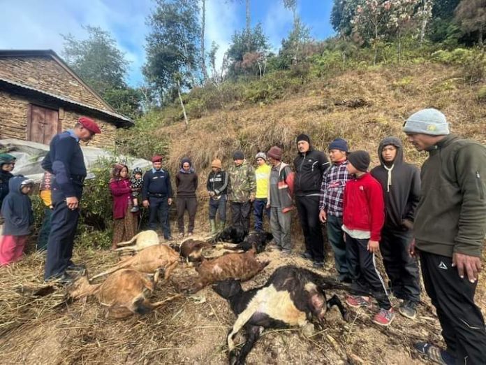 शुक्रबार राती कुडो पकाउने चुलोमा आगो ननिभेको र उक्त आगो गोठमा फैलिएपछी धुवाँले निसास्सिएर ८ वटा बाख्रा मरेको र खोर जलेर नस्ट भएको आगलागी पीडित क्षेत्रीले जानकारी दिनुभयो । अचानक गोठमा लागेको आगोमा परेर बाख्रा मरेपछि आफुलाई ठुलो क्षति पुगेको पीडितको भनाइ छ । बाख्रा र खोर जलेपछी ३ लाख भन्दा बढी नोक्सानी भएको उहाँले बताउनुभयो । आफुले जिविकोपार्जनका लागि पालेका बाख्रा आगोमा परेरे मरेपछि अहिले आफुलाइ ठूलो क्षति पुगेको बताउदै सम्बन्धि निकायसँग सहयोगको अपिल गर्नुभएको छ । आगोमा परि बाख्रा मरेको घटना गाउँपालिकालाई जानकारी गराएको र पालिका अध्यक्षले सहयोगको आश्वासन दिनुभएको क्षेत्रीले बताउनुभयो ।