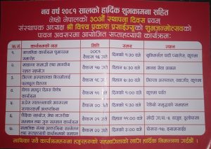 कार्यक्रम अन्तर्गत पहिलो दिन वैशाख १६ गते कुश्माको युनिभर्सल पाटी प्यालेसमा साप्तहिक कार्यक्रम शुभारम्भ समारोह रहने संस्थापक अध्यक्ष विश्व प्रकाश प्रसाईंले जानकारी दिनुभयो । कार्यक्रमको दोस्रो दिन बागलुङमा रहेको मानव सेवा आश्रममा खाद्यान्न सामाग्री तथा मानवीय राहात सहयोग गरिने बताइएको छ । तेस्रो दिन जिल्ला अस्पताल पर्वतका बिरामीलाई फलफुल वितरण गरिने र चौथो विश्व मजदुर दिवस रहेकाले विश्व मजदुर दिवस विशेष कार्यक्रम रहने छ । पाँचौ दिन वैशाख २० गते प्रेस स्वतन्त्रता दिवसका अवसरमा सञ्चारकर्मी अन्तरक्रिया कार्यक्रम संचालन गरिने प्रसाइले बताउनुभयो । कार्यक्रमको छैठौं दिन शैक्षिक सहयोग, जेष्ठ नागरीक सम्मान तथा गुरु सम्मान कार्यक्रम रहेको छ भने सातौं दिन सामाजिक संस्था अन्तरक्रिया सम्मेलन तथा सप्ताहव्यापी कार्यक्रमको समापन गरिने बताएको छ ।