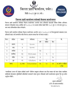 पुस महिनाको १९ दिनमा मात्र २९ जना फरार प्रतिवादीहरुलाई पक्राउ गरेर फैसला कार्यान्वयनका लागि अदालतमा पेश गरिएको जिल्ला प्रहरी कार्यालय पवर्तका सूचना अधिकारी एवं प्रहरी निरक्षिक रामप्रसाद सापकोटाले जानकारी दिए । उनका अनुसार चालु आर्थिक वर्ष ०८१/०८२ को श्रावण महिनादेखि पुस १९ गतेसम्म ६८ जना फरार प्रतिवादीहरुलाई पक्राउ गरिएको छ ।